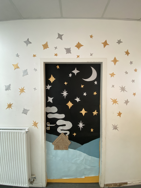 Participation au concours de décoration des portes de l'établissement sur le thème du chalet. Décor de la porte de la salle d'Arts Plastiques réalisé avec l'aide des 6ème4