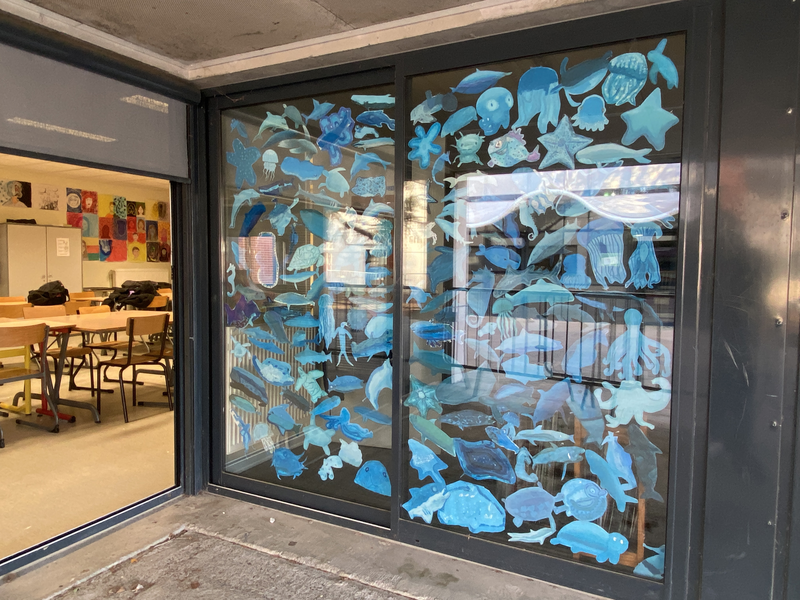 La créature marine : Représenter en utilisant une seule couleur. Affichage sur la vitre de la réserve des Arts Plastiques (je suis désolée pour les reflets mais c'ést compliqué de ne pas en avoir)